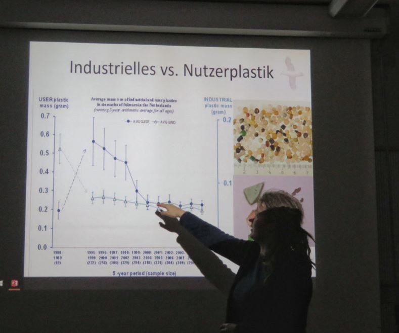 Im Anschluss an die Müllsammlung gab es einen richtig guten Vortrag über die Auswirkungen des Plastikmülls auf Meeresvögel von Susanne Kühn, die in den Niederlanden zu diesem Thema an Eissturmvögeln forscht. Sie hatte sehr viel gutes Anschauungsmaterial mitgebracht, und wir hatten die Möglichkeit, selber in die Mägen von verendeten Vögeln zu schauen. In jedem einzelnen Magen fanden wir erschreckend viele Plastikstücke. Danke für diese Einblicke. Es ist nochmal ein Unterschied, ob man das nur gehört oder auch mal mit eigenen Augen gesehen hat.