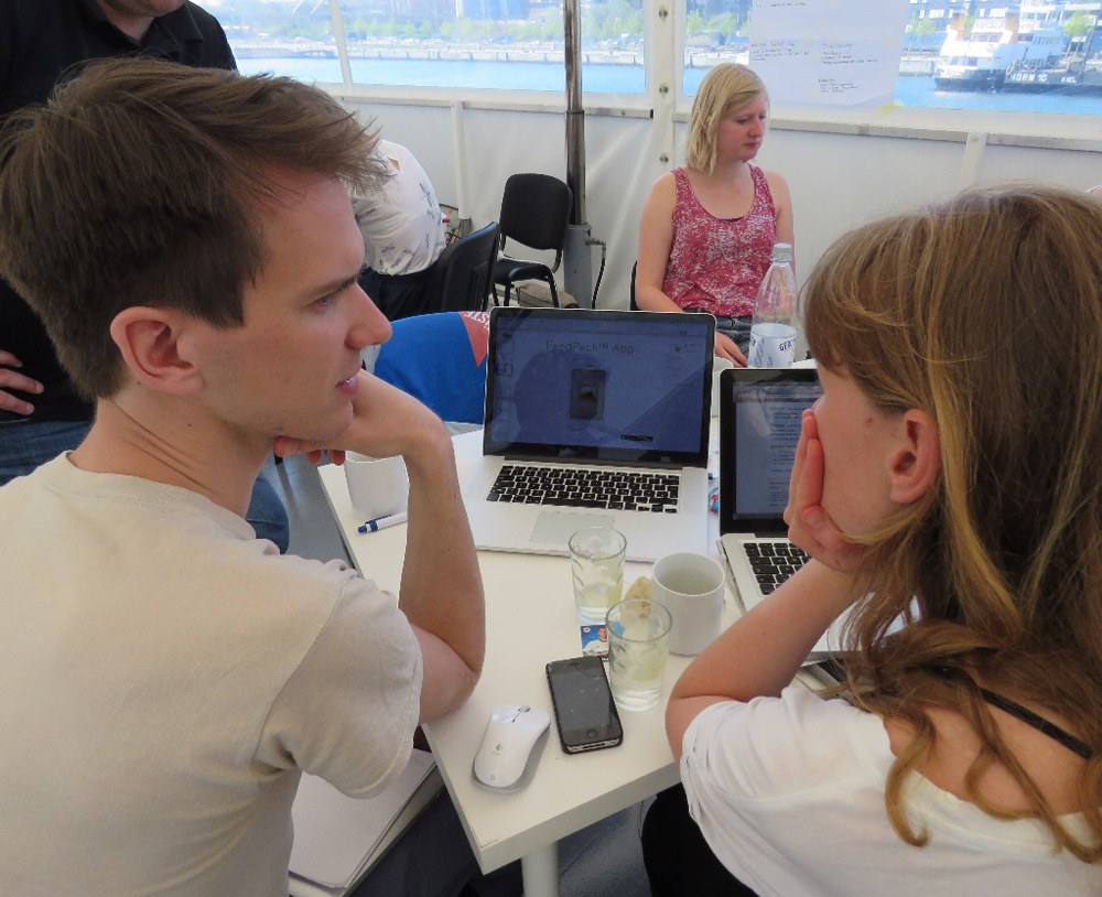 Inspiriert durch unsere Vereinsvorstellung fand sich dann ein klasse Team aus Programmierern, Designern und Wissenschaftlern, das es sich zum Ziel gemacht hat, an diesem Wochenende eine Smartphone-App zu entwickeln, mit der Verbraucher im Supermarkt den Herstellern von Produkten Feedback zu ihren Plastikverpackungen geben können!